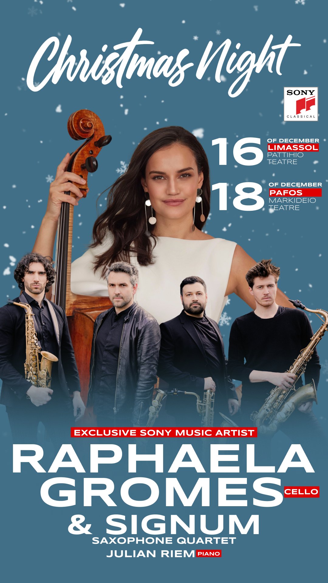 Отметьте наступление праздников вместе с виолончелисткой мирового уровня Рафаэлой Громес (эксклюзивная артистка Sony Music), знаменитым саксофонным квартетом Signum и пианистом Юлианом Риемом.